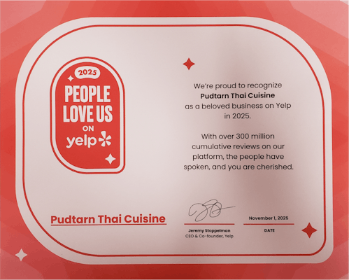 At Pudtarn, we cook the way we would for our own family—because to us, every customer is like family. Our recipes are rooted in generations of Thai home cooking, bringing you comforting flavors and familiar warmth in every bite. Whether it's our flavorful curries, perfectly stir-fried noodles, or rich soups, each dish is prepared just like we would serve at our own dinner table.